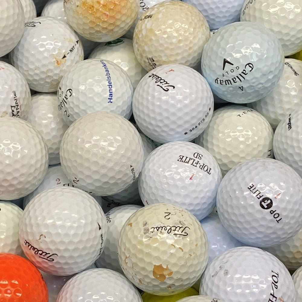 Backspin Treningsballer C/D er brukte golfballer med kraftig kosmetisk slitasje fra mange ulike merker og modeller. De er laget for én ting: mest mulig slag til lavest mulig pris.